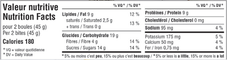 Ingrédients: Sucres (pâte de dattes, *nectar d'agave) • Amandes • *Protéines de pois • Noix de coco séchée • Beurre d'amandes • Graines de chia • Sel de mer.
