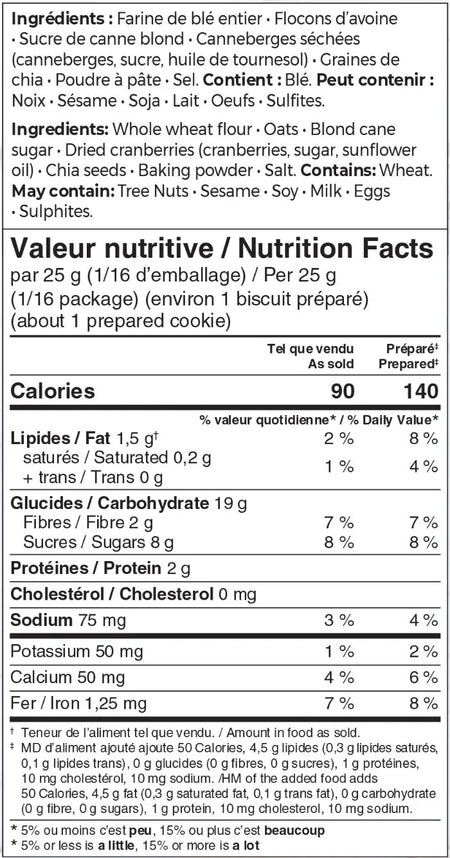 Ingrédients : Farine de blé entier · Flocons d'avoine · Sucre de canne blond · Canneberges séchées (canneberges, sucres, huile de tournesol) · Graines de chia · Poudre à pâte · Sel.