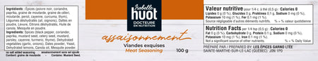 Ingrédients : Épices (poivre noir, coriandre, paprika, graine de moutarde, graine de céleri, moutarde, persil, cayenne, curcuma, thym), Légumes déshydratés (ail, oignons), Dattes en poudre, Levure, Citrons déshydratés, Huile de canola, Mesquite en poudre.