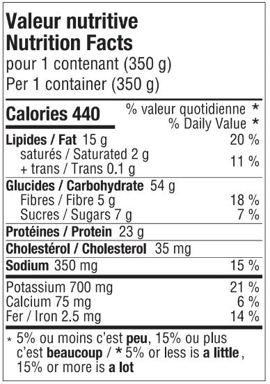 Ingredients: Vegetable mix: Broccoli - Edamame - Red bell pepper - Carrot - Onion. Rice mix: Rice (water, brown rice, canola oil) - Sesame oil - Ground ginger - Onion powder - Granulated garlic. Sauce: Water - Garlic - Canola oil - Ginger - Brown sugar - Mushrooms - Soy protein - Rice vinegar (water, rice) - Modified cornstarch - Chicken glaze (chicken broth, carrot, onion, garlic) - Vinegar - Sesame seeds - Yeast extract - Sesame oil - Onion - Natural flavour. Chicken: Chicken breast - Water - Salt - Potassium chloride. Sesame seeds. Spices.