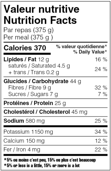 Ingredients: Mixed peppers · Lean ground beef and pork · Diced tomatoes · Butternut squash · Kidney beans · Black beans · Celery · Tomato paste · Vegetable base · Coriander · Garlic · Cornstarch · Canola oil · Chili powder · Pepper · Tabasco sauce · Salt.