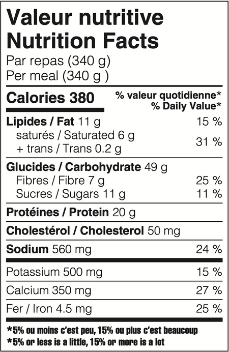 Ingredients: Tortellini (Pasta: durum wheat semolina, liquid whole eggs, water and as appropriate, spinach powder or tomato powder. Filling: Ricotta cheese, parmesan cheese, toasted wheat crumbs, salt, pepper, spices) · Vegetables (green peas, mushrooms) · Sauce (tomatoes, milk, onion, cream, tomato paste, nutritional yeast, cornstarch, garlic, salt, paprika, pepper) · Swiss cheese.