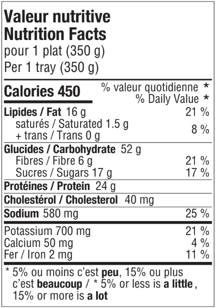 Ingredients: Cooked brown rice (water, brown rice, canola oil) • Mangoes • Cooked seasoned chicken breast fillets coated with modified corn starch (chicken breast fillets, water, modified corn starch, salt) • Red bell peppers • Edamame • Sauce (tamari soy sauce, canola oil, honey, water, spice, garlic, xanthan gum) • Sesame oil • Granulated garlic • Spices.