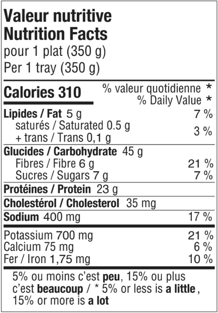 INGREDIENTS: Couscous (couscous, water, broccoli, cauliflower, chickpea, canola oil, parsley), Sauce (water, tomato, onion, carrot, seasoning, salt, celery, garlic, canola oil, modified corn starch, vinegar, natural flavor), Seasoned chicken breast fillets (chicken breast fillets, water, modified corn starch, salt), Sweet potato.