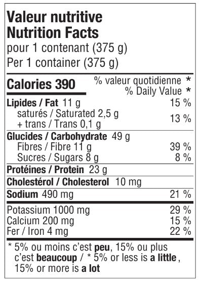Ingredients: Sauce: Water - Tomato - Soy concentrate (soy protein concentrate, caramel) - Onion - Celery - Carrot - Canola oil - Liquid salt - Garlic - Modified starch - Seasoning (spices, yeast extract, onion) - Natural flavour - Spice extract. Cooked pasta : Water - Penne (whole grain durum wheat flour) - Canola oil - Xanthan gum. Zucchini. Bell pepper. Onion. Parmesan cheese (milk). Fine herbs.