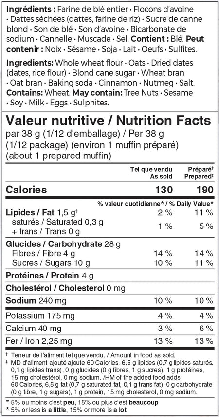 Ingredients: Whole wheat flour, Rolled oats, Sugar, Wheat bran, Dried date, Oat bran, Baking soda, Cinnamon, Nutmeg, Salt.
