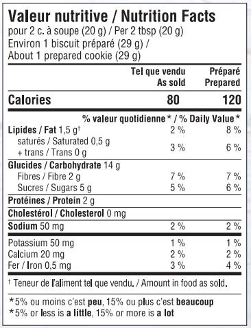 Ingrédients : Farine de blé entier ᐧ Flocons d’avoine ᐧ Sucre de canne ᐧ Chocolat noir (pâte de cacao, sucre, beurre de cacao, lécithine de soya, arôme naturel de vanille) ᐧ Graines de chia ᐧ Poudre à pâte ᐧ Sel.